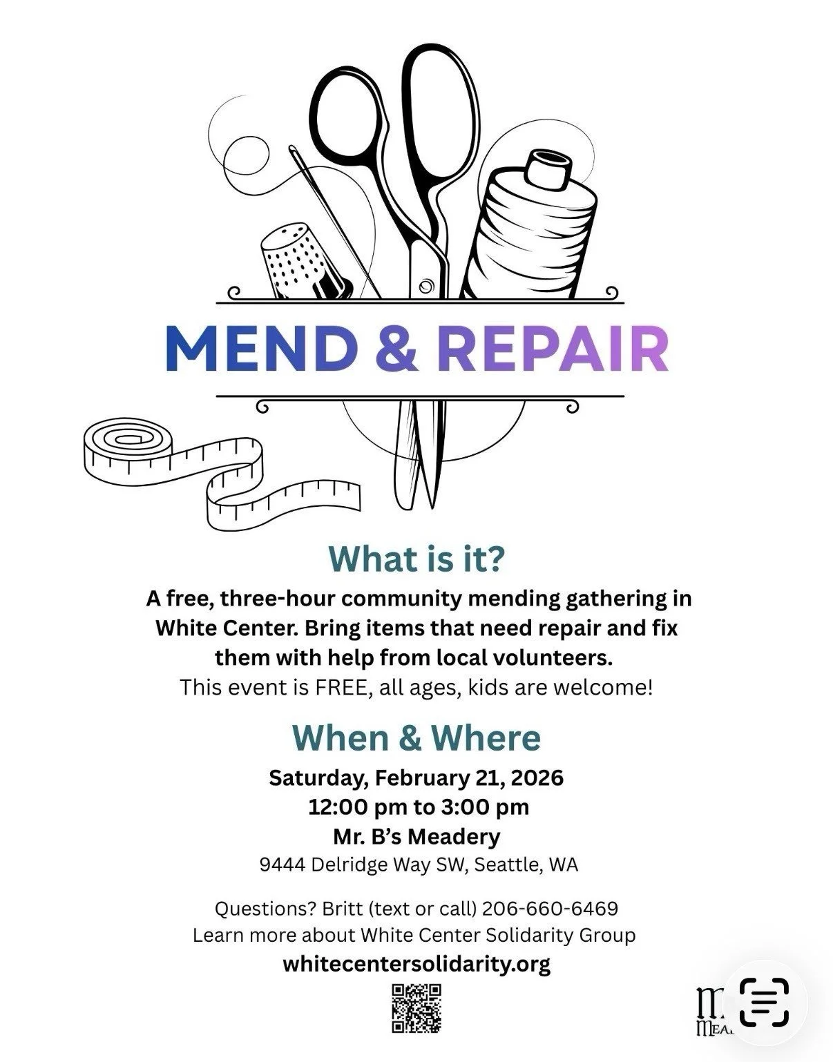 A free, three-hour community mending gathering in White Center. Bring items that need repair and fix them with help from local volunteers.